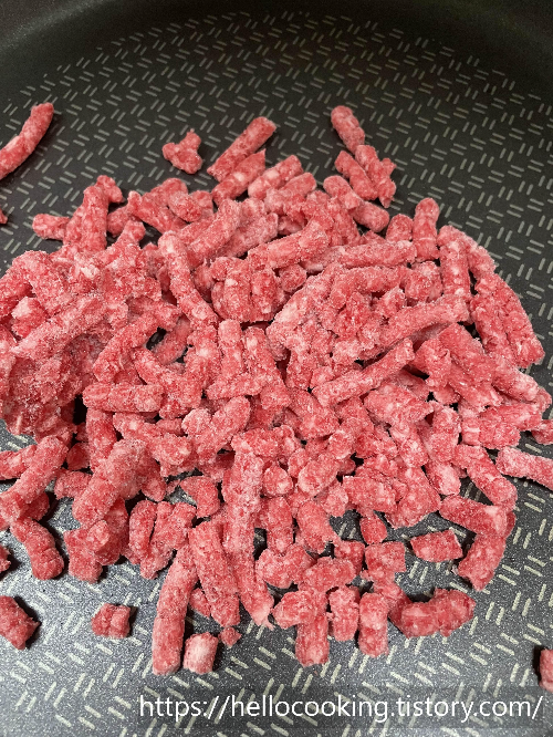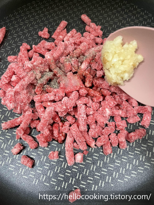 팬에 식용유를 두르고 소고기 다짐육을 넣어주세요.