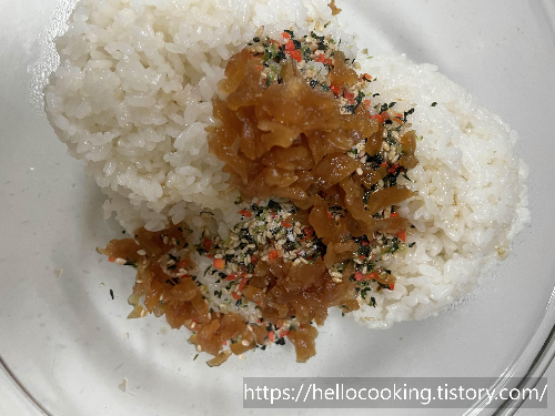 간장 0.5T, 미림 0.5T, 설탕 1T, 다진 마늘 약간, 후추 톡톡톡 넣어서 볶아줍니다.