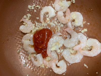 새우가 어느정도 익었다면 케첩 2T를 넣어주세요.