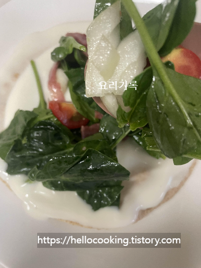 만들어둔 샐러드를 듬뿍 올려주세요.