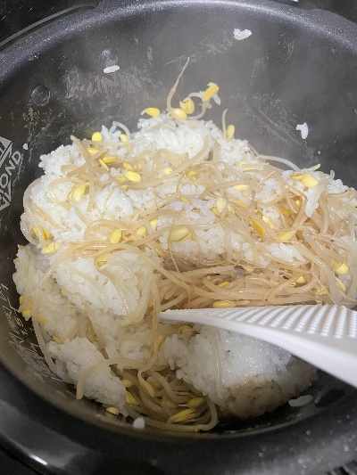 물을 맞추고 깨끗하게 손질한 콩나물을 쌀 위로 얹어줍니다.