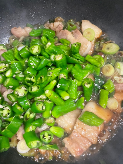 꽈리고추, 삼겹살, 대파, 청양고추가 잘 어우러져서 밥이랑 먹어도 너무 맛있고 안주로 해도 너무 맛있습니다.