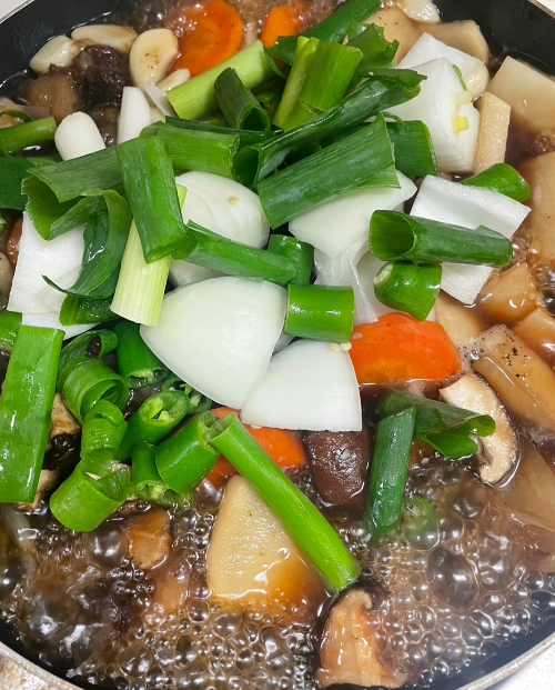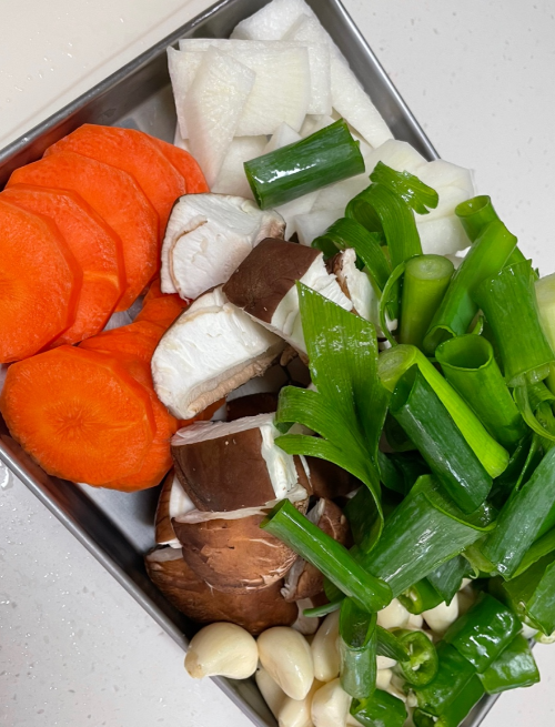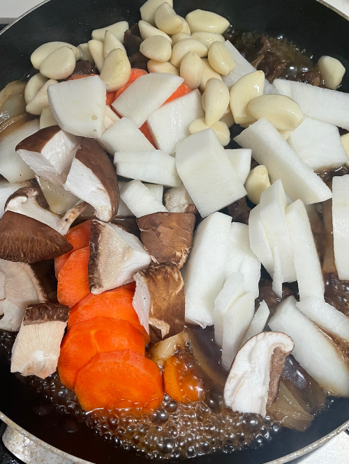 무, 당근, 표고버섯, 마늘, 밤, 대추를 넣고 끓이는데 이때 중 약불로 끓여주세요.