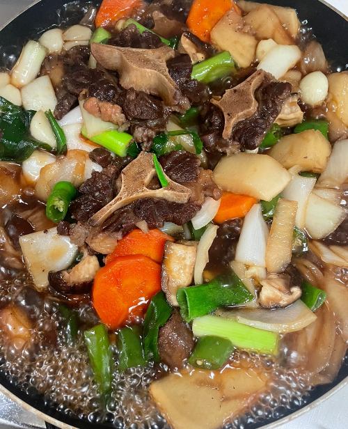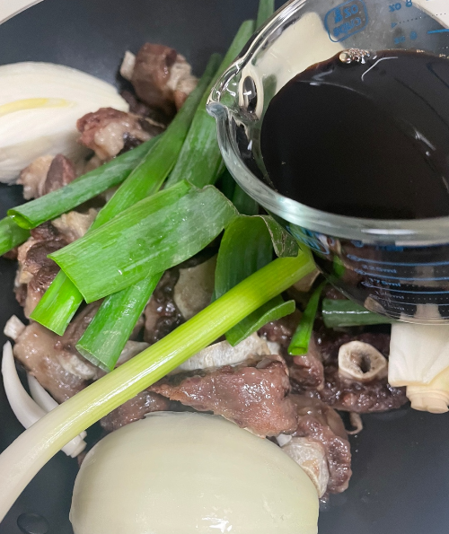 이제 소꼬리를 웍에 옮겨주고 준비된 대파, 양파, 간장, 설탕, 후춧가루, 물을 넣어서 끓이시면 됩니다. 이때 생강 있으신 분들은 생강도 넣어서 끓여주세요.