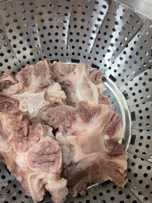 한번 데친 소꼬리를 이제 압력솥에 쪄줄 거예요. 압력솥에 물을 살짝 넣고 채반을 깔아줍니다. (압력솥 타는 거 방지)