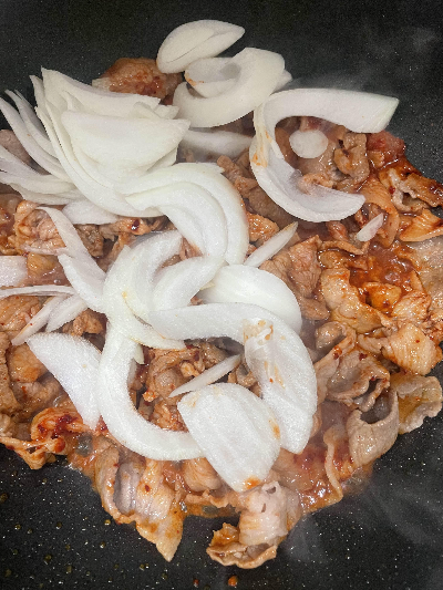어느정도 양념장들이 고기와 어우러졌으면 양파 반개를 넣고 잘 볶아줍니다.