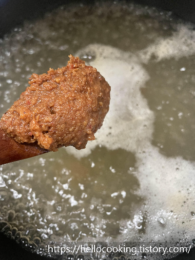 물이 팔팔 끓고 육수가 우러나오면 된장 1T를 넣어 끓여줍니다.