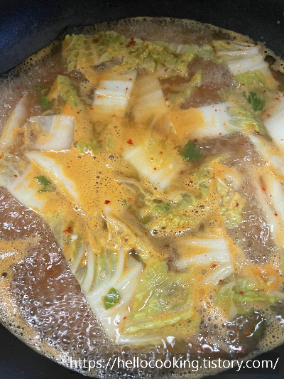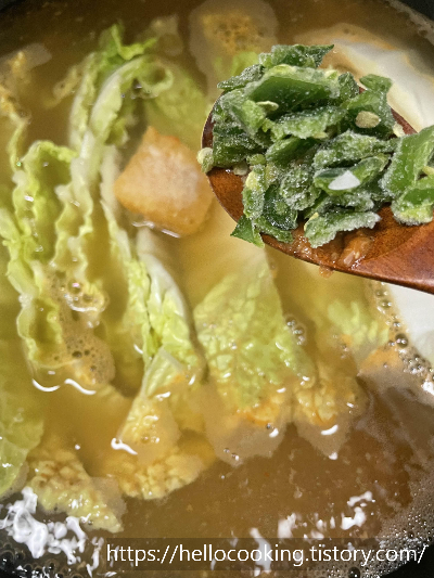 된장이 잘 풀리면 배추를 넣고 끓여주세요.