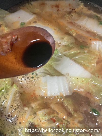 여기서 간을 보시고 좀 싱겁다 싶으시면 국간장 0.5T를 추가로 넣어줍니다.