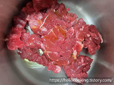 소고기를 올리브유 2T에 잘 볶아주세요.
