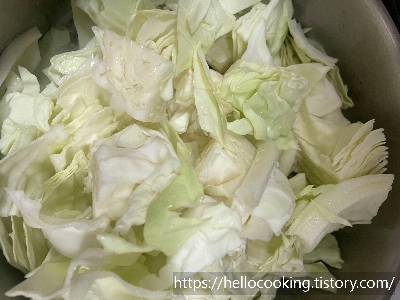 양배추를 잘 썰어서 씻어서 냄비에 넣고 잘 볶아주세요.