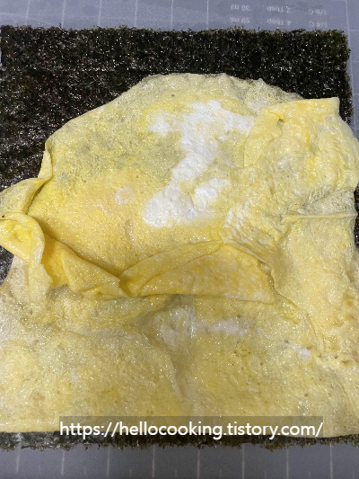 계란 지단 2장 중 한 장을 반을 접어서 깔아주세요.