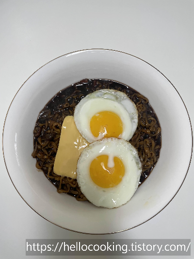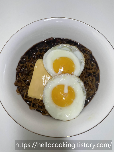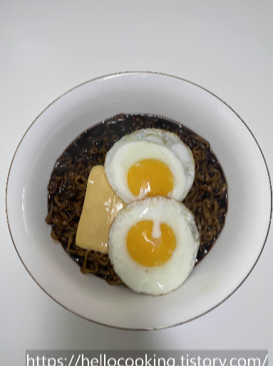 짜장라면 + 계란 프라이 + 치즈 이렇게 해서 먹는 건데 너무 맛있습니다.